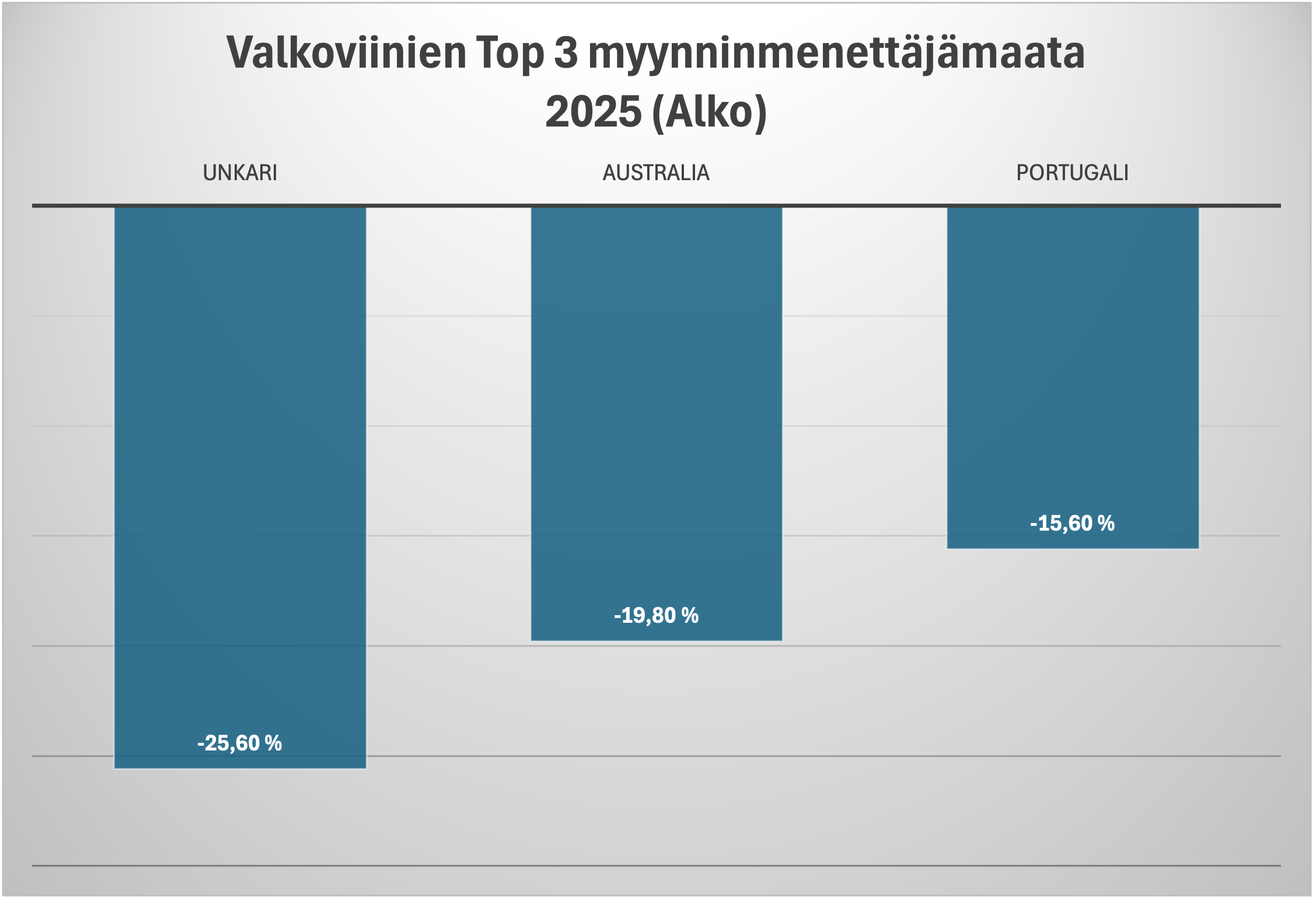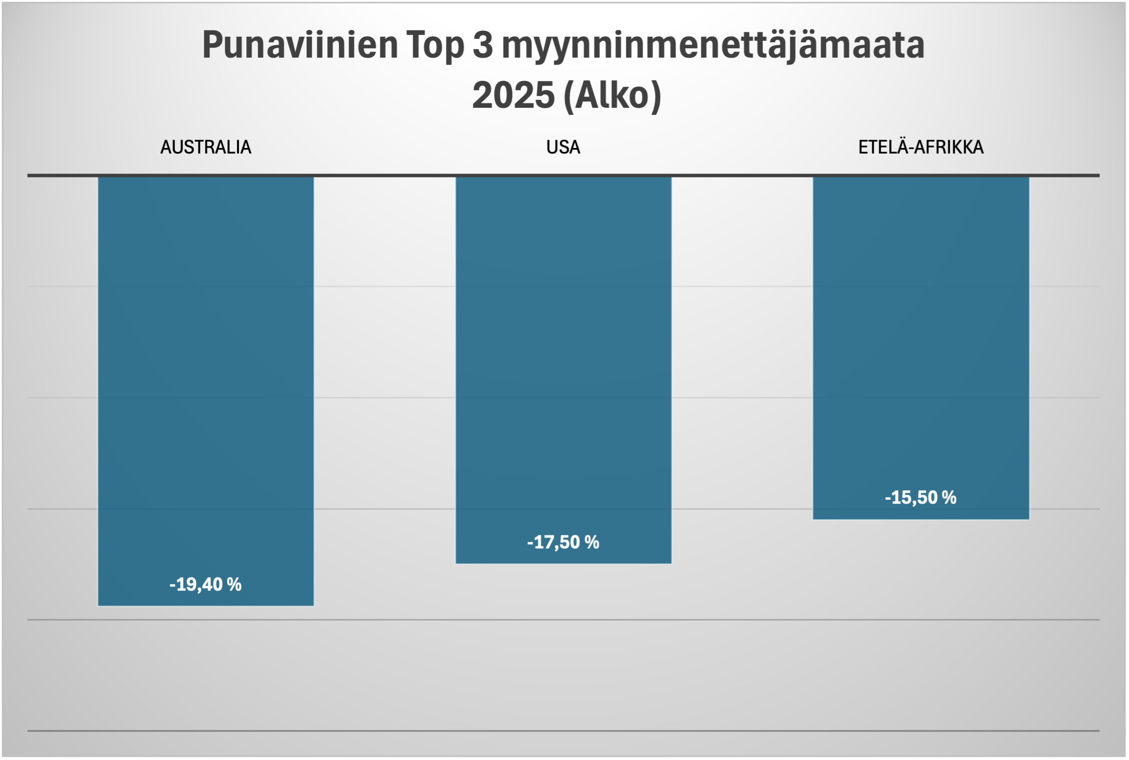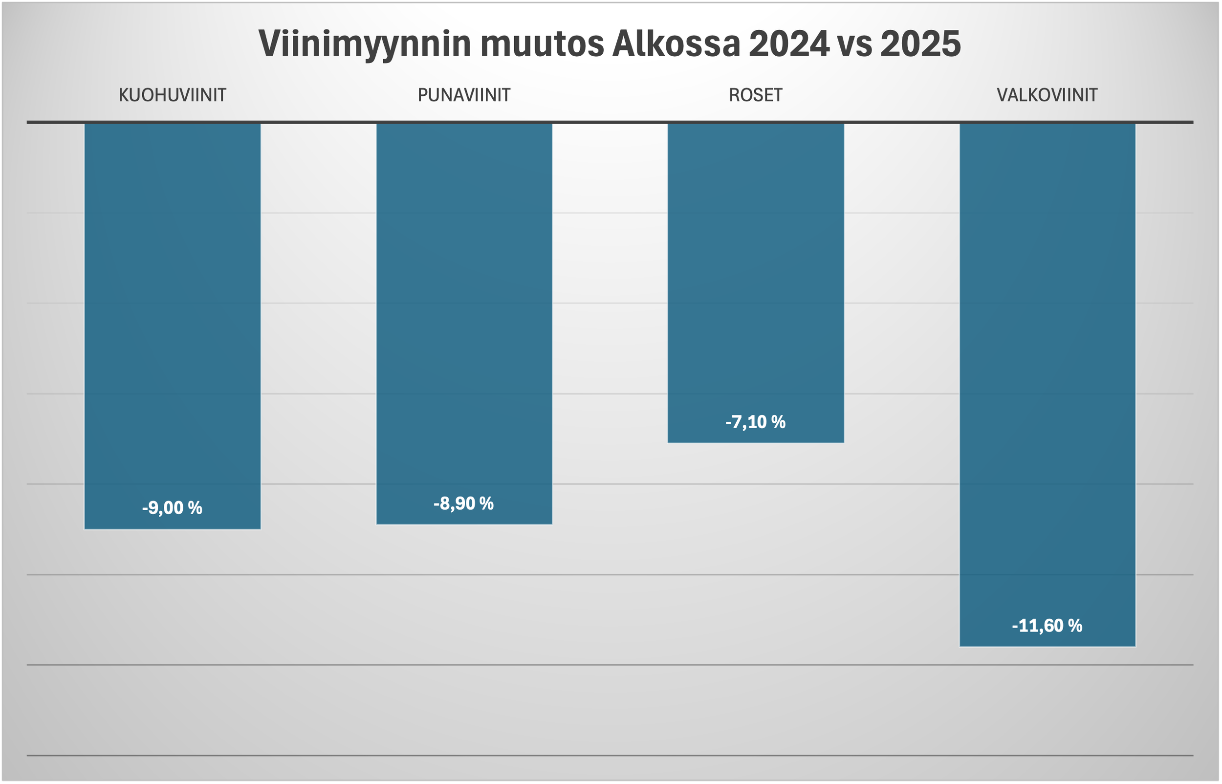 Tammi–lokakuussa 2025 Alko menetti 3,7 miljoonaa litraa viinimyyntiä, mikä tarkoittaa –10,5 prosentin laskua verrattuna samaan ajanjaksoon vuonna 2024.